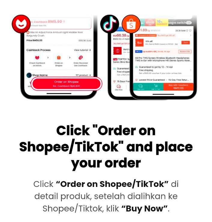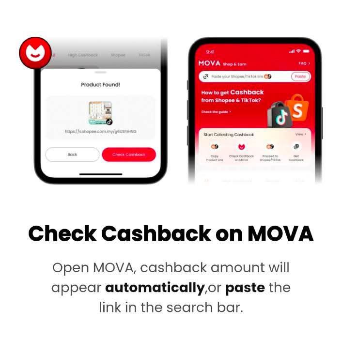 Guna MOVA Cashback, anda boleh dapat pulangan tunai (cashback) bila shopping di Shopee & TikTok Shop.