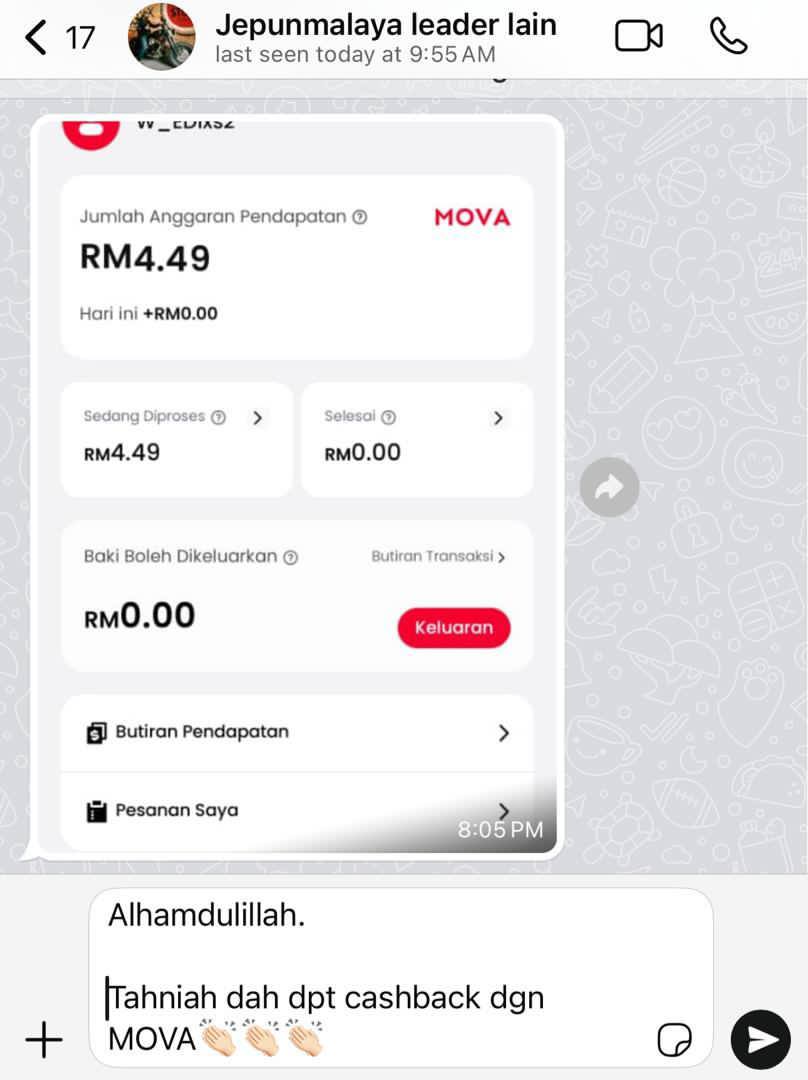 Caj pengeluaran cashback MOVA ialah RM1.50 sahaja.