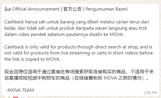 “Cashback hanya sah untuk barang yang dibeli melalui carian terus dari kedai, dan tidak sah untuk produk daripada siaran langsung atau troli dalam video pendek sebelum pautannya disalin ke MOVA.”